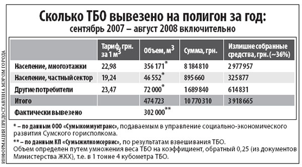 Опираясь на существующие нормативы, ООО «Сумыкоммунтранс» всегда декларировало то, что в городе Сумы производится около 475 тыс. куб. м, а то и 500 тыс. куб. м ТБО. Всегда «забивало» в расчет тарифа цифру 475 тыс. куб. м. и, пользуясь тем, что этого никто никогда не проверит, ни разу не делало перерасчета за отклонение от норматива!