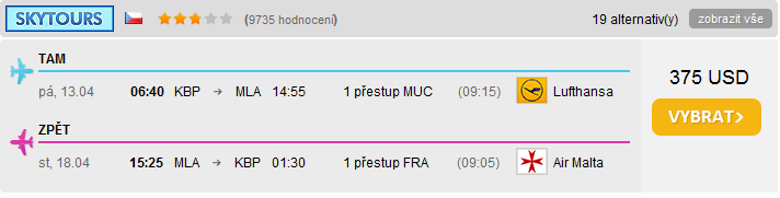 Lufthansa (туда) + Air Malta (обратно) прямо из Киева с одной пересадкой в Германии — от 350$ (цена в две стороны). Вы, правда, даты не указали, поэтому смотрел на апрель.Как добраться на мальту и обратно побюджетней? А то 400у.е. в один конец за безпересадку не вдохновляют...