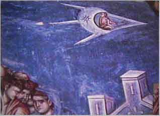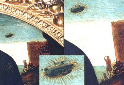 Достаточно часто необычные явления наблюдали в эпоху средневековья, что и стало частью полотен произведений художников, запечатлевших увиденное на века. В ХV в. Итальянский художник Domenico Ghirlandino на холсте отобразил поразившее его воображение событие. Фрагменты его картины ’’Мадонна’’ приведена ниже. Рис. 9. Художник ХIII в. Masolino da Panicale на одной из фресок, ’’Распятие Христа’’, воспроизвел полет НЛО. Фрагмент этой фрески перед вами. Рис. 10.