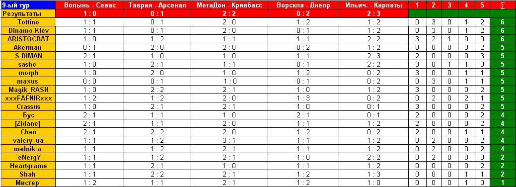 melnik-a Member 06.09.10 #181 Волынь - Севастополь 1-1 Таврия - Арсенал 1-2 Металлург Д - Кривбасс 2-1 Ворскла - Днепр 1-1 Ильичевец - Карпаты 1-2
