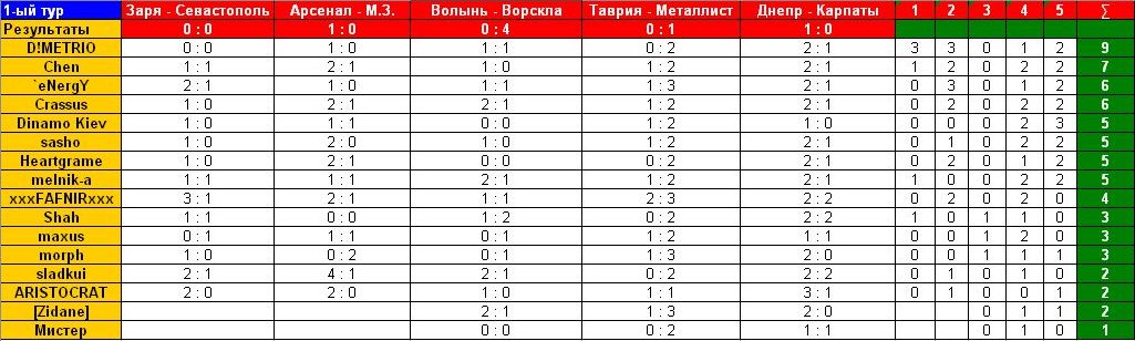 melnik-a Member 09.07.10 #14 Заря - ПФК Севастополь 1-1 Арсенал - Металлург З 1-1 Волынь - Ворскла 2-1 Таврия - Металлист 1-2 Днепр - Карпаты 2-1