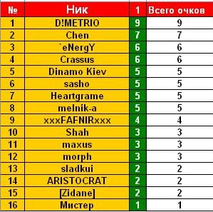 xxxFAFNIRxxx Вечный студент :) 11.07.10 #19 Результаты: Заря - ПФК Севастополь 0-0 Арсенал - Металлург З 1-0 Волынь - Ворскла 0-4 Таврия - Металлист 0-1 Днепр - Карпаты 1-0 Вкладення 1.jpg 83.2 КБ Перегляди: 385 itog.jpg 27.7 КБ Перегляди: 389