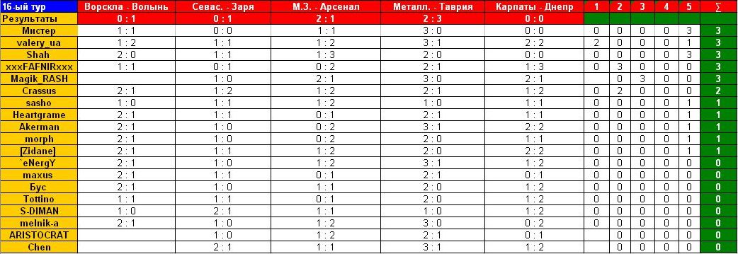 xxxFAFNIRxxx Вечный студент :) 05.11.10 #321 Ворскла - Волынь 1-1 Севастополь - Заря 0-1 Металлург З - Арсенал 0-2 Металлист - Таврия 2-1 Карпаты - Днепр 1-3