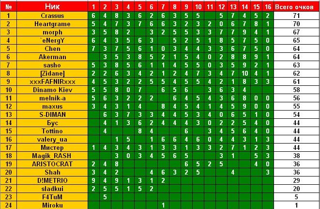 xxxFAFNIRxxx Вечный студент :) 09.11.10 #326 Результаты: Ворскла - Волынь 0-1 Севастополь - Заря 0-1 Металлург З - Арсенал 2-1 Металлист - Таврия 2-3 Карпаты - Днепр 0-0 Вкладення 16.jpg 96.1 КБ Перегляди: 271 itog.jpg 97.9 КБ Перегляди: 281
