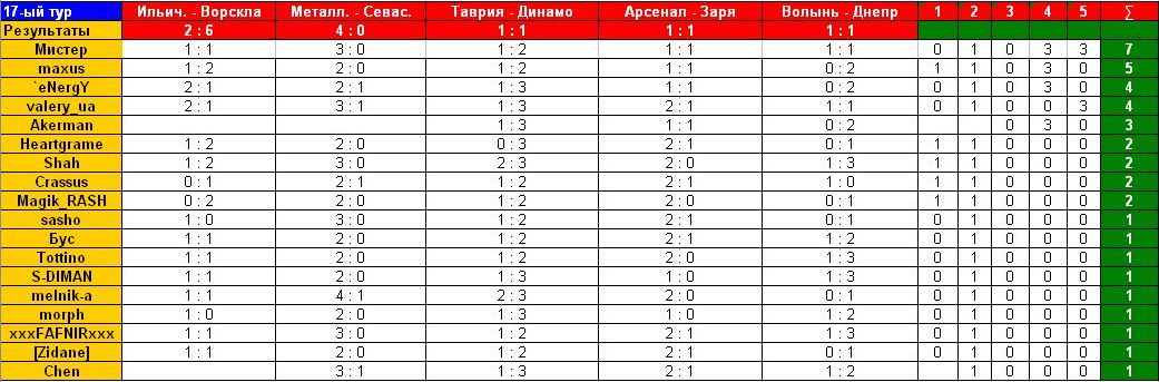 aker122 Active Member Модератор 14.11.10 #345 если можно немножко с опозданием: Таврия - Динамо 1-3 Арсенал - Заря 1-1 Волынь - Днепр 0-2
