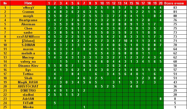 xxxFAFNIRxxx Вечный студент :) 08.03.11 #397 Результаты: Заря - Волынь 3:0 Металлург Д - Динамо 0:2 Ворскла - Металлист 0:0 Кривбасс - Оболонь 2:2 Арсенал - Карпаты 2:2 Вкладення 20.jpg 71.8 КБ Перегляди: 259 itog.jpg 120.5 КБ Перегляди: 339