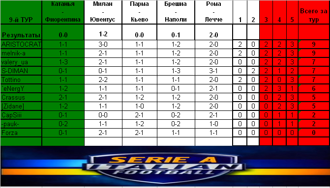 Результаты 9 тура Катанья - Фиорентина 0-0 Милан - Ювентус 1-2 Парма - Кьево 0-0 Брешиа - Наполи 0-1 Рома - Лечче 2-0