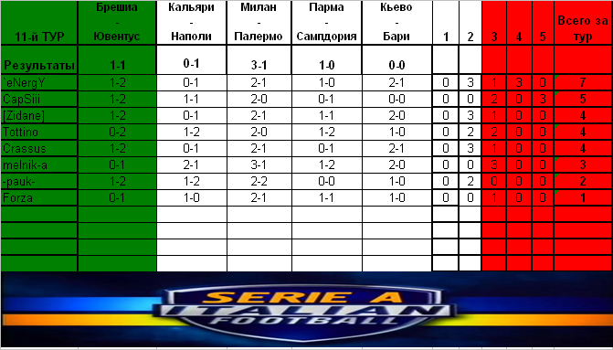 melnik-a Member 09.11.10 #141 Брешиа - Ювентус 0-1 Кальяри - Наполи 2-1 Милан - Палермо 3-1 Парма - Сампдория 1-2 Кьево - Бари 2-0